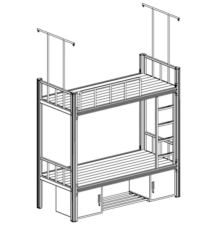 1. 床架:床架为钢结构,采用组装、卡槽、插接式拼装而成,拆装方便,床架应不会摇动,安全且稳定牢靠,床立柱与上下短横梁固定使用插卡式链接,床立柱、床横梁与床桓固定使用插卡式链接(整体拆装)牢固美观,平整度、着地平稳性、涂层理化性能、结构安全、耐久性等指标均符合国家要求。